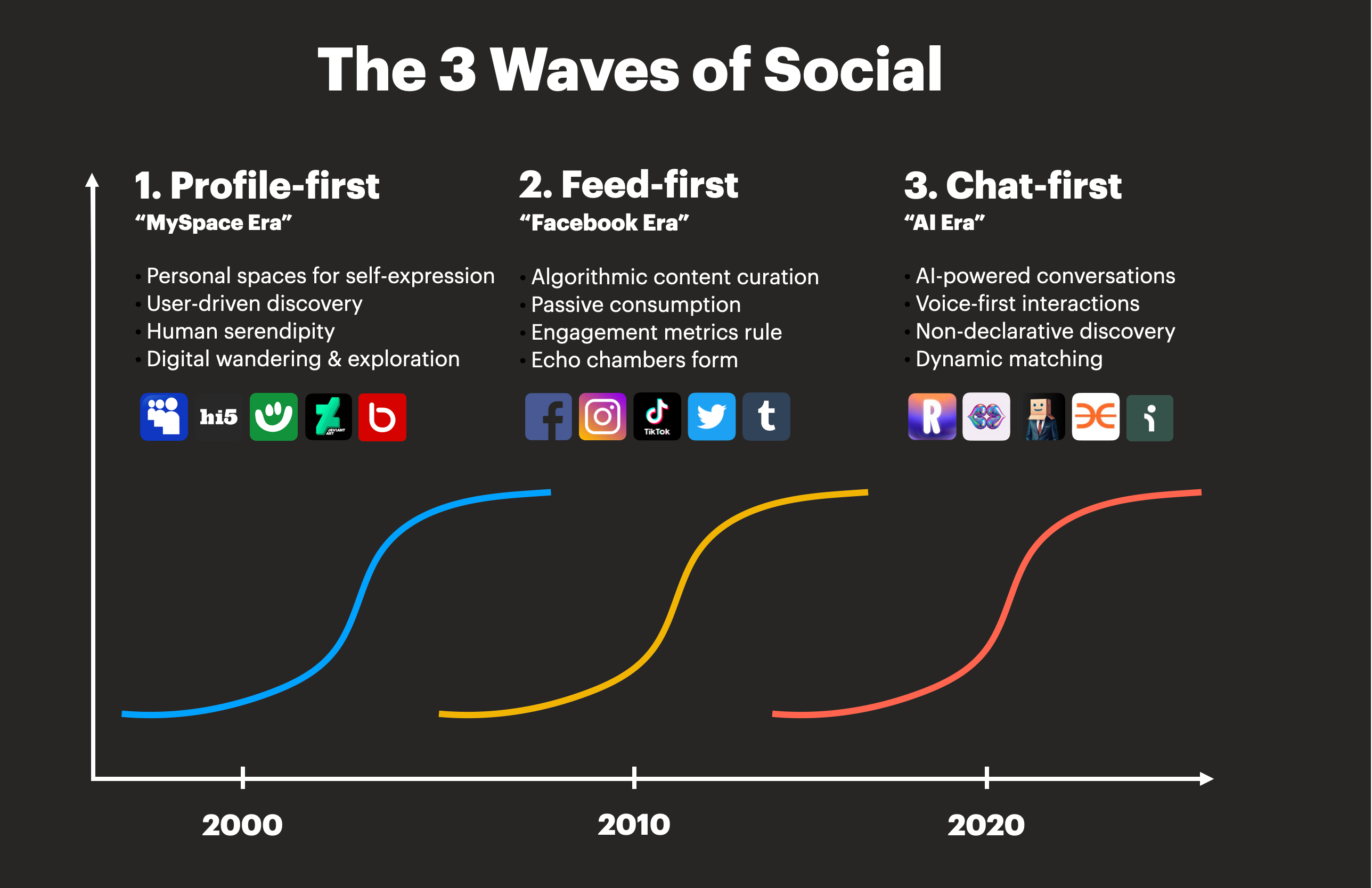 3rd wave - Chat-first: Now AI-powered conversations enable uniquely tailored interactions, replacing passive consumption with dynamic exchanges that evolve based on real-time context. Like a skilled host at a dinner party, AI enables more natural discovery of both content and connections, making each interaction genuinely personal.